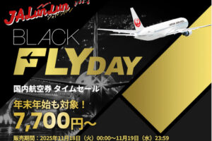 JALは2025年11月18日〜19日の期間、ブラックフライデーにあわせて国内線が7,700円〜になるタイムセールを実施します。 搭乗期間が2025年12月26日〜2026年2月28日の航空券が対象です。 …
