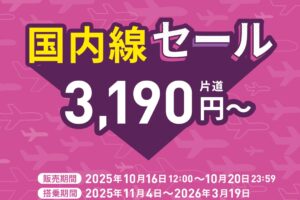 Peach(ピーチ)は2025年10月16日12時から、「国内線セール」を実施します。 セールは一番リーズナブルなミニマム運賃が対象です。 セール対象路線と価格 大阪 (関西) ー 札幌 (新千歳) 4,7…