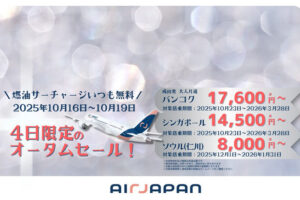 AirJapan(エアージャパン)は2025年10月16日より、3路線が対象の「オータムセール」を実施しています。 セール価格 成田⇒バンコク 片道22,000円~ 成田⇒シンガポール 片道18,660円~…