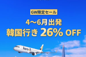 Aero K(エアロK)は2026年4月6日〜19日の期間、韓国線が26%OFFになるコードを配布しています。 プロモーションコードは「RF26GW」です。 対象路線と価格 ・茨城 → 仁川 7,990円〜…
