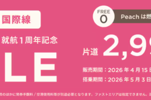 Peach(ピーチ)は2026年4月15日12時から、ソウル(金浦)線就航1周年記念セールを実施します。 こちらはソウルの金浦空港就航1周年を記念したセールです。 セール対象路線と価格 <国内線>…