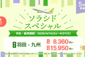 Solaseed Air(ソラシドエア)は2026年4月14日から、割引運賃「ソラシドスペシャル」を販売しています。 ソラシドスペシャル対象路線と運賃 東京(羽田)⇔宮崎 9,900円〜 東京(羽田)⇔熊本…