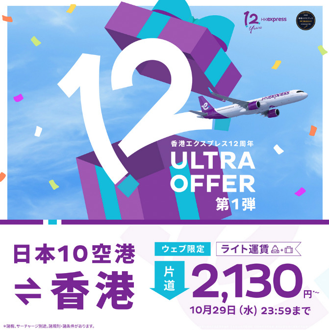 香港エクスプレス航空は2025年10月27日から、香港線10路線がお得になる「ウルトラオファー」を実施しています。
