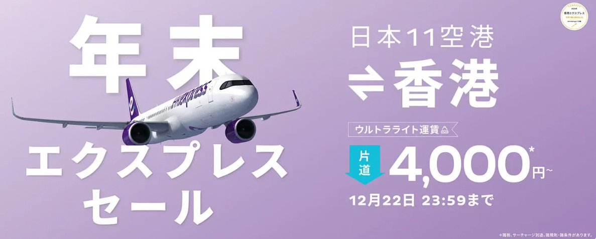 香港エクスプレス航空は2025年12月16日から、香港線11路線がお得になる「年末エクスプレスセール」を実施しています。