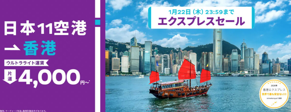 香港エクスプレス航空は2026年1月21日11時から、香港線11路線がお得になる「エクスプレスセール」を実施しています。