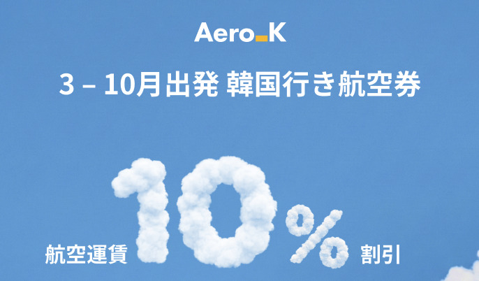 Aero K(エアロK)は2026年2月23日〜6月30日の期間、韓国線が10%OFFになるコードを配布しています。