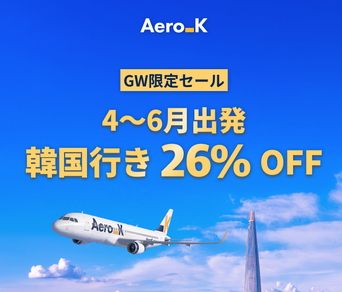 Aero K(エアロK)は2026年4月6日〜19日の期間、韓国線が26%OFFになるコードを配布しています。