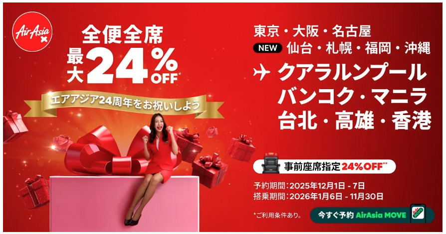 AirAsia(エアアジア)は2025年12月1日より、全便全席24%オフセールを実施しています。