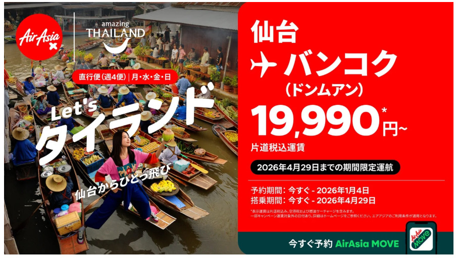 AirAsia(エアアジア)、2025年12月15日〜2026年1月4日 仙台⇔バンコク線就航を記念したセールを実施