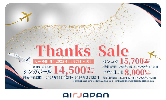 AirJapan(エアージャパン)は2025年11月7日より、全路線が対象の「THANKS SALE」を実施しています。 セール価格 成田⇒バンコク 片道20,100円~ 成田⇒シンガポール 片道18,66…