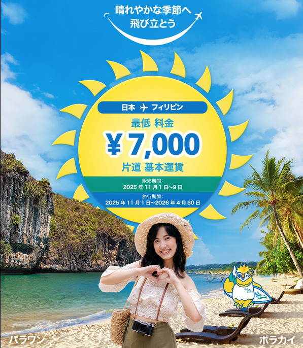 セブパシフィック航空は2025年11月1日から、フィリピン線が7,000円〜になるセールを実施しています。