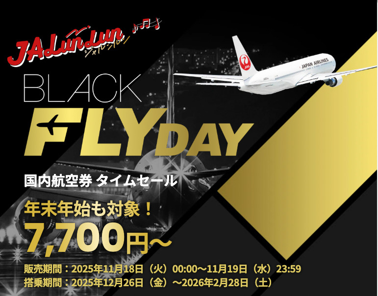 JALは2025年11月18日〜19日の期間、ブラックフライデーにあわせて国内線が7,700円〜になるタイムセールを実施します。