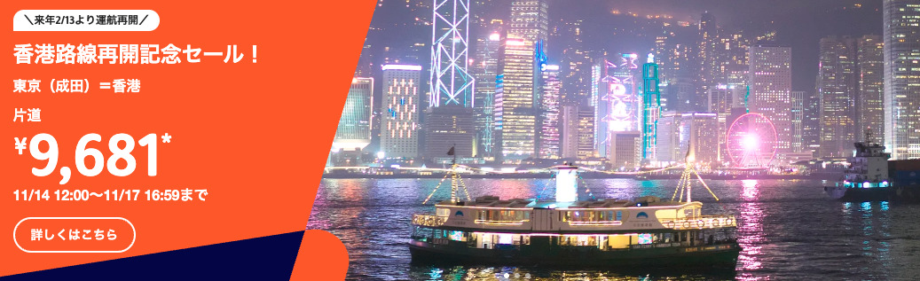 Jetstar(ジェットスター)は2025年11月14日12時から、アジア路線が対象の「香港路線再開記念セール」を実施します。