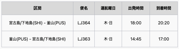 2026.02.26 ニュース JAMBO Jin Air(ジンエアー)、2026年4月2日より宮古島⇔釜山線に新規就航 Twitter Facebook Google+ はてブ Pocket ジンエアーは2026年4月2日より宮古島⇔釜山線に新規就航します。 この路線、LCCではジンエアーが初就航です。 運航スケジュール 所要時間は片道約2時間。 運航は木・日の週2往復です。 現在の運賃は片道15,960円〜となっています。 [via=ジンエアー] -スポンサーリンク- <シェアボタン> Twitter Facebook LINE feedly