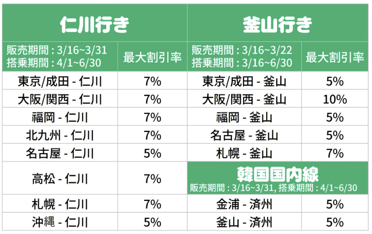 Jin Air (ジンエアー)は2026年3月16日〜31日の期間、韓国線最大10%OFF+オプション割引キャンペーンを実施しています。