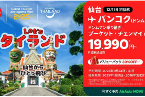 AirAsia(エアアジア)は2025年11月24日から、仙台⇔バンコク線就航を記念したセールを実施しています。 この路線の就航は2025年12月1日で、運航曜日は月・水・金・日。 飛行時間は往路は7時間30分、復路は6…