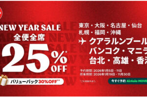 AirAsia(エアアジア)は2026年1月5日より、全便全席25%オフセールを実施しています。 こちらは新春セールです。 日本路線と価格 東京(羽田空港)⇔マレーシア(クアラルンプール国際空港) 21,5…