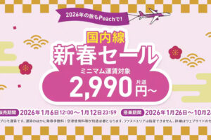 Peach(ピーチ)は2026年1月6日12時から、「国内線 新春セール」を実施します。 セールは一番リーズナブルなミニマム運賃が対象です。 セール対象路線と価格 大阪 (関西) ー 仙台 3,790円〜 …
