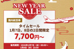 JALは2026年1月7日〜8日の期間、新春セールとして国内線が7,700円〜になるタイムセールを実施します。 搭乗期間が2026年2月1日〜3月28日の航空券が対象です。 セール料金例 ・羽田-新千歳 7…