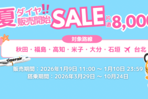 タイガーエア台湾は2026年1月9日11時から、一部台湾線がお得になる「夏ダイヤ記念セール」を実施しています。 セール対象路線と価格 秋田↔ 台北:片道10,500円~ 福島↔ …