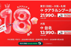 AirAsia(エアアジア)は2025年10月27日より、「就航18周年記念セール」を実施しています。 エアアジア X(D7)が就航18周年を迎えたことを記念し、同社が運航する都市を対象とした特別セールを実施です。 &n…