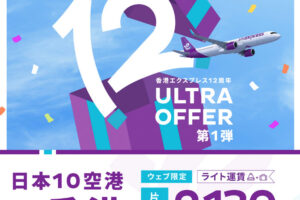 香港エクスプレス航空は2025年10月27日から、香港線10路線がお得になる「ウルトラオファー」を実施しています。 こちらは日本就航12周年を記念したセールです。 セール対象路線と価格 東京(成田国際空港)…