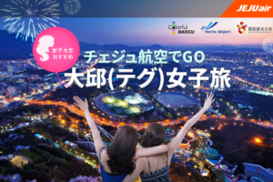 JEJUair(チェジュ航空)は本日3月18日から、「“大邱(テグ)” 女子旅セール」を実施しています。 このセールは、チェジュ航空・大邱広域市・韓国観光公社・成田国際空港の4社による、「女子旅」をテーマとした大邱への渡…
