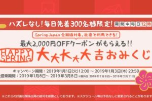 春秋航空は2019年1月1日12時から、毎日先着300名にクーポンをプレゼントする「大大大大大吉おみくじ」を実施しています。 期間中、毎日先着300名にお年玉クーポンをプレゼント。 おみくじは「大大吉(2,000円)」「…