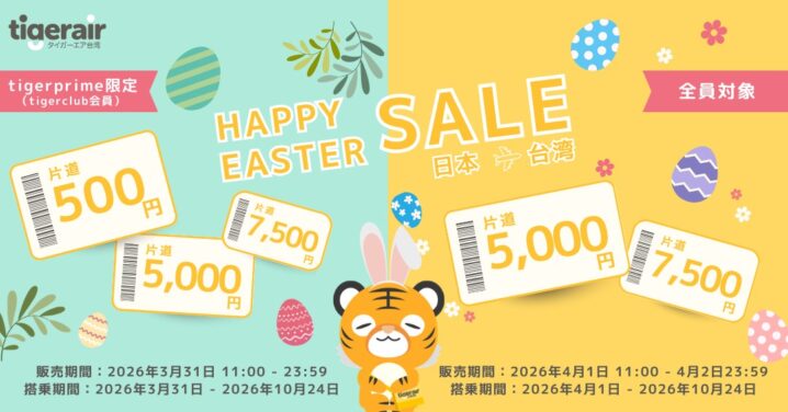 タイガーエア台湾は2026年3月31日11時から、台湾線がお得になる「ハッピーイースターSALE」を実施しています。 今回のセールは2回に分けて実施されます。 3月31日11時〜23時59分のセール(tig…