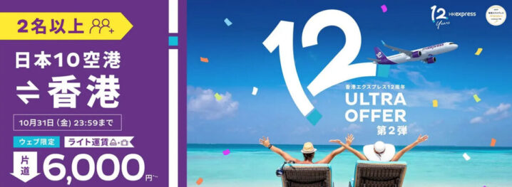 香港エクスプレス航空、2025年10月30日〜31日 香港線10路線が2名以上でお得にお得になる「ウルトラオファー」