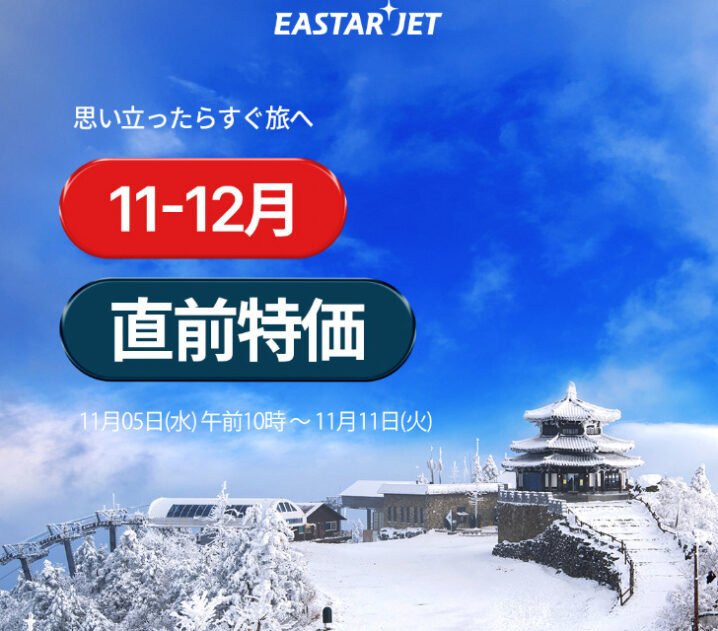 イースター航空は2025年11月5日10時から、韓国線がお得になる「直前特価セール」を実施します。 セール対象路線と価格 大阪(関西国際空港)⇔韓国/釜山(金海国際空港)1,470円〜 北海道(新千歳空港)…