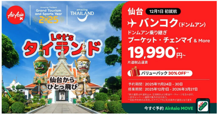 AirAsia(エアアジア)は2025年11月24日から、仙台⇔バンコク線就航を記念したセールを実施しています。 この路線の就航は2025年12月1日で、運航曜日は月・水・金・日。 飛行時間は往路は7時間30分、復路は6…