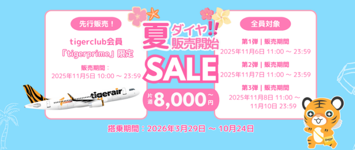 タイガーエア台湾は2025年11月5日10時から、台湾線がお得になる「夏ダイヤ販売スタート&期間限定セール」を実施します。 今回のセールは4回に分かれており、1回目の11月5日はメンバーシッププログラム「tigerclu…