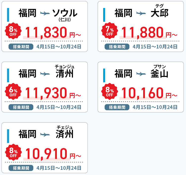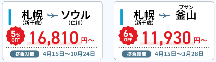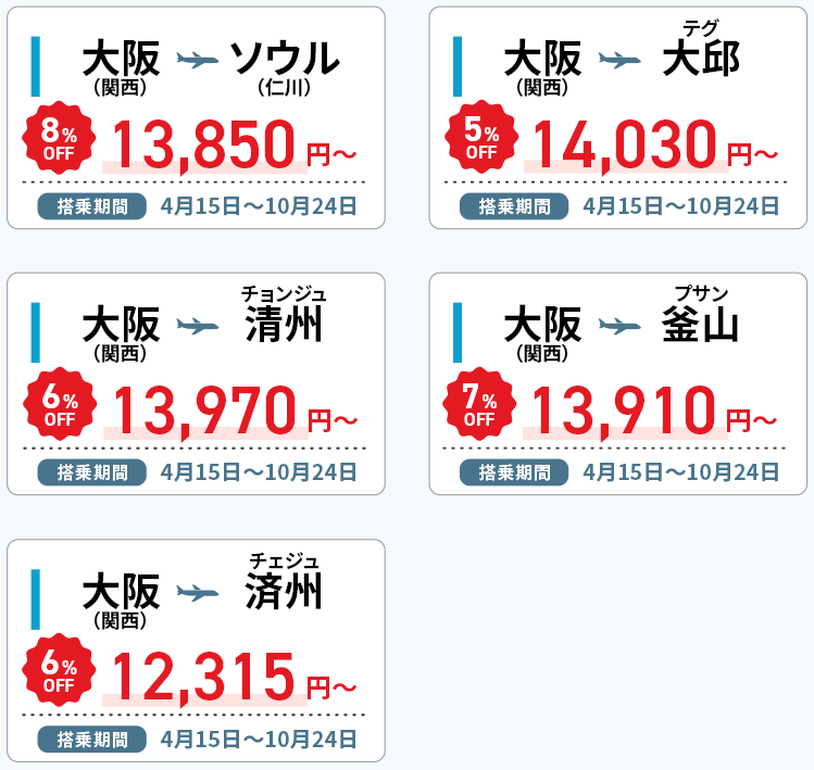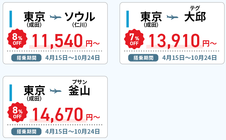 キャンペーンでは、割引コードとクーポンの利用で韓国路線がお得になります。