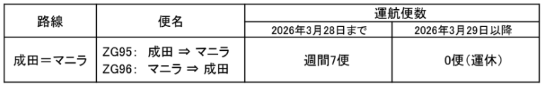 ZIPAIR(ジップエア)は2026年3月29日より、成田⇔マニラ線を運休します。